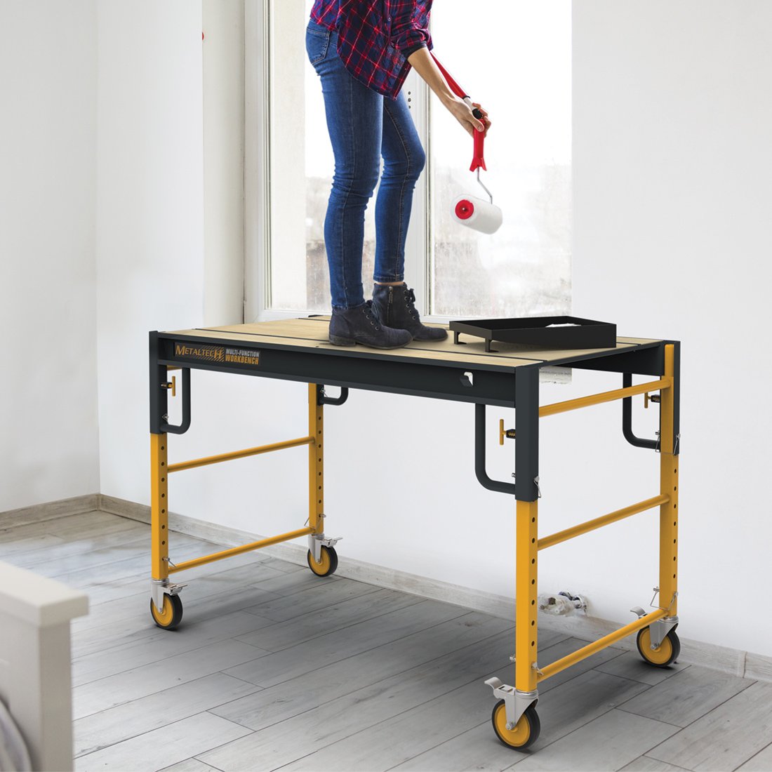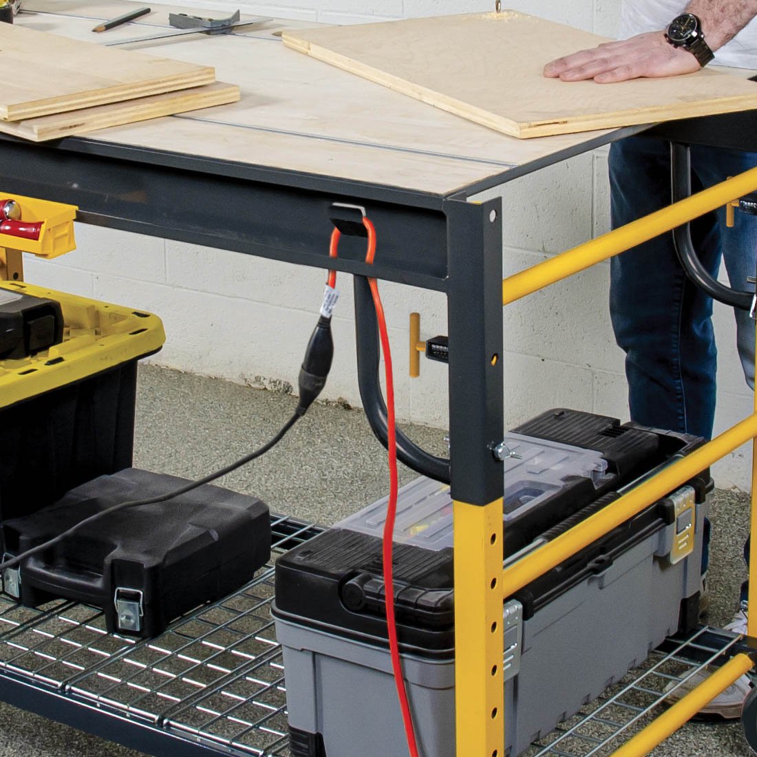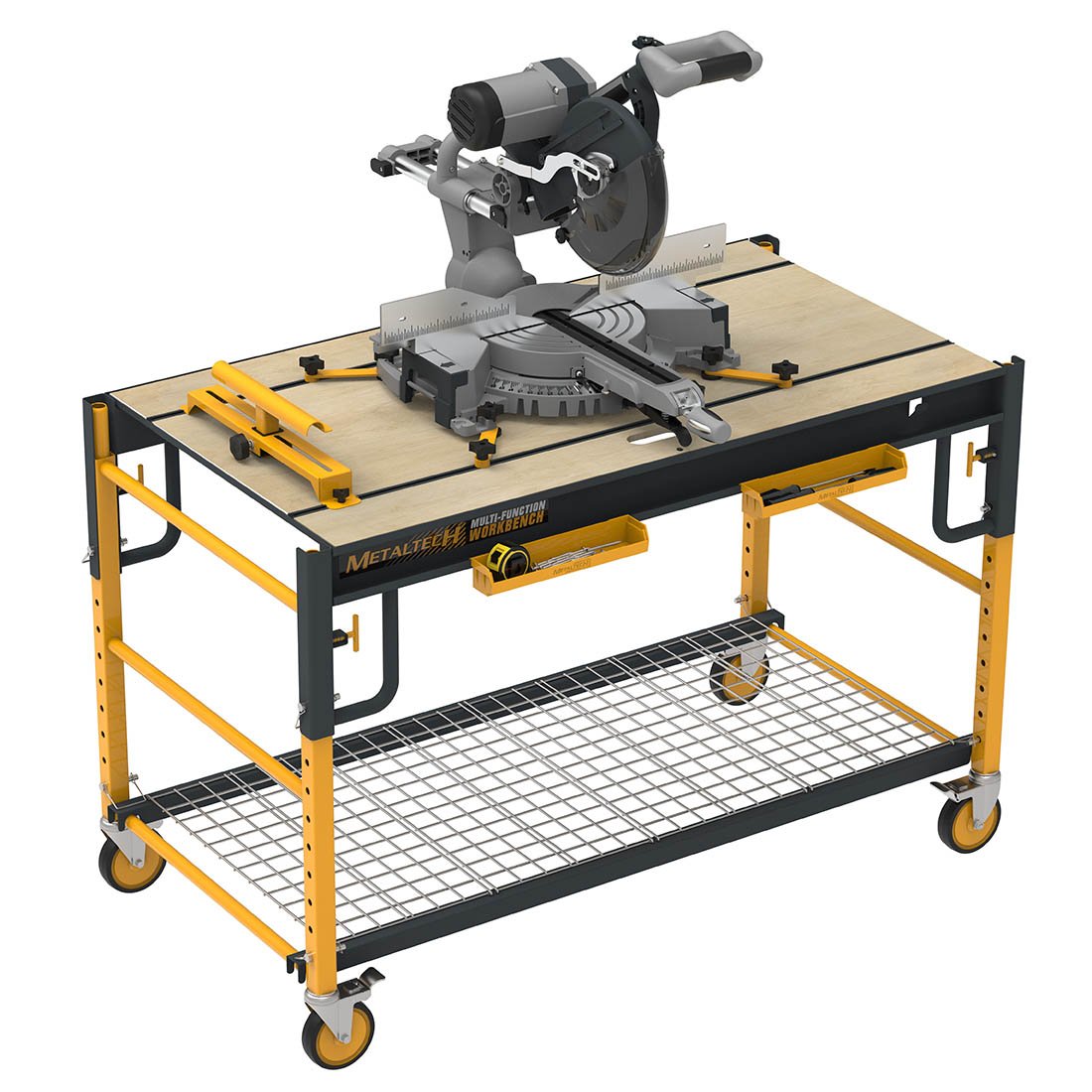 5 EN 1 TODO INCLUIDO: soporte para sierra ingletadora, banco de trabajo, carro de transporte, estante de almacenamiento y plataforma de trabajo.